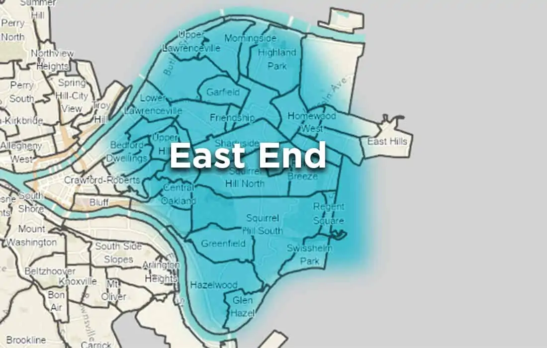 The triangle of land that makes up the East End is bounded by the Allegheny River and Rt-28 to the North and the Monongahela River and Parkway East I-376 to the South. Through the middle, the main arteries of Penn, Liberty, Fifth and Forbes Avenues run from the city into the various neighborhoods. The easy commutes to Downtown, major employment, and access to cultural, outdoor, and economic amenities are the main attraction for residents, along with the benefit of excellent appreciation over the past few years.